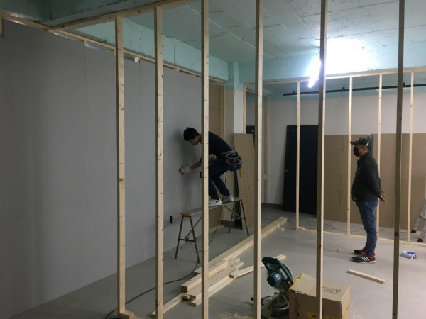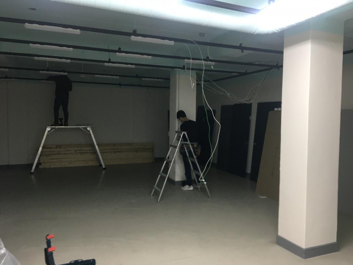 칸막이공사 1일차) 천장조명 제거, 벽 골조 세우고 석고보드 붙이기